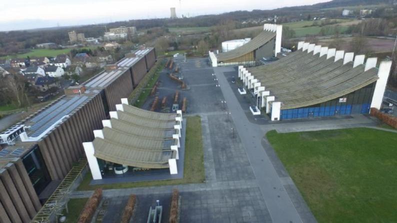 Die Dachform, die an eine Sprungschanze erinnert, folgt dem Verlauf der zwischen schlanken Stahlbetonpylonen aufgehängten Stahlseile. Diese Art der Hängedachkonstruktion eignet sich sehr gut zur stützenfreien Überwindung großer Spannweiten und wird seit den 1950er Jahren vielfach auch für freie Grundrissformen angewendet.